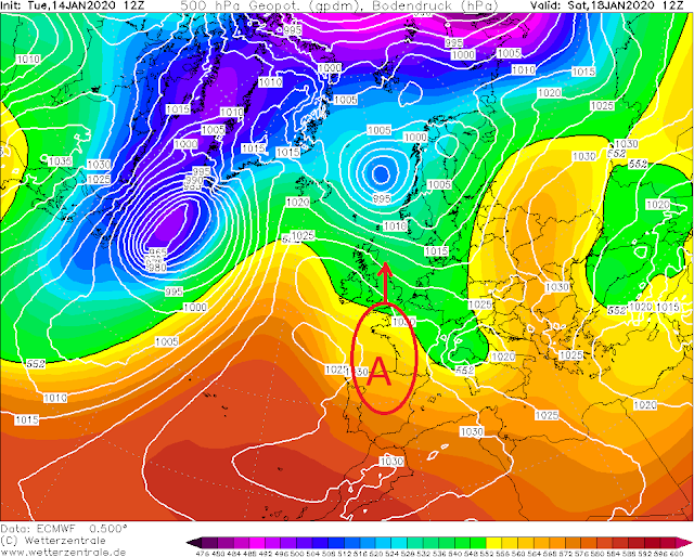 En el modelo ECMWF el anticiclon ascendería justo encima de la península dejando un Sábado tranquilo en el Pirineo.