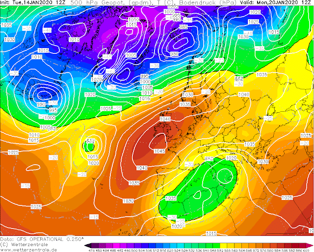 El GFS estira el anticiclon de Sw a NE y seguiríamos con norte bastante fuerte con toque mas continental, las nevadas irían remitiendo pero seguirá el frío y el viento.