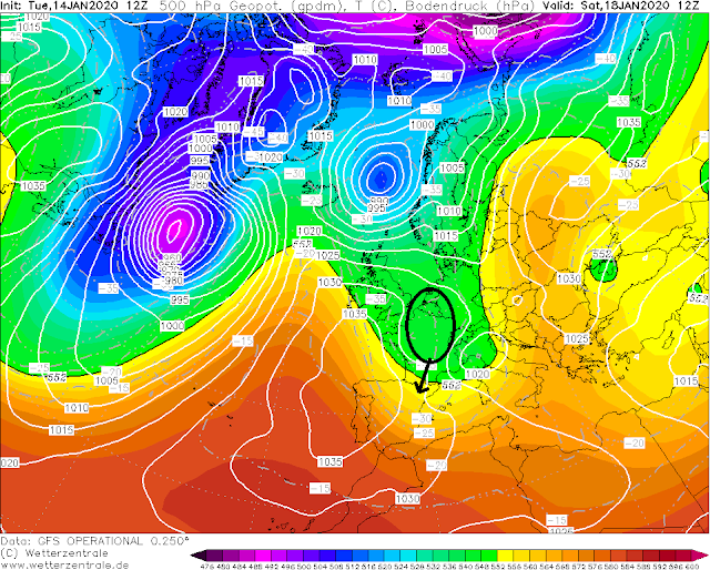 El ECMWF tumba mas el anticiclon de W a E y se aísla una bolsa de aire frío en niveles altos(DANA) al sur de la península lo que favorecería un pasillo de levante muy húmedo, vamos un temporal de levante en toda regla, donde las estaciones del Sistema Ibérico podrían recibir una nevada de campeonato.
