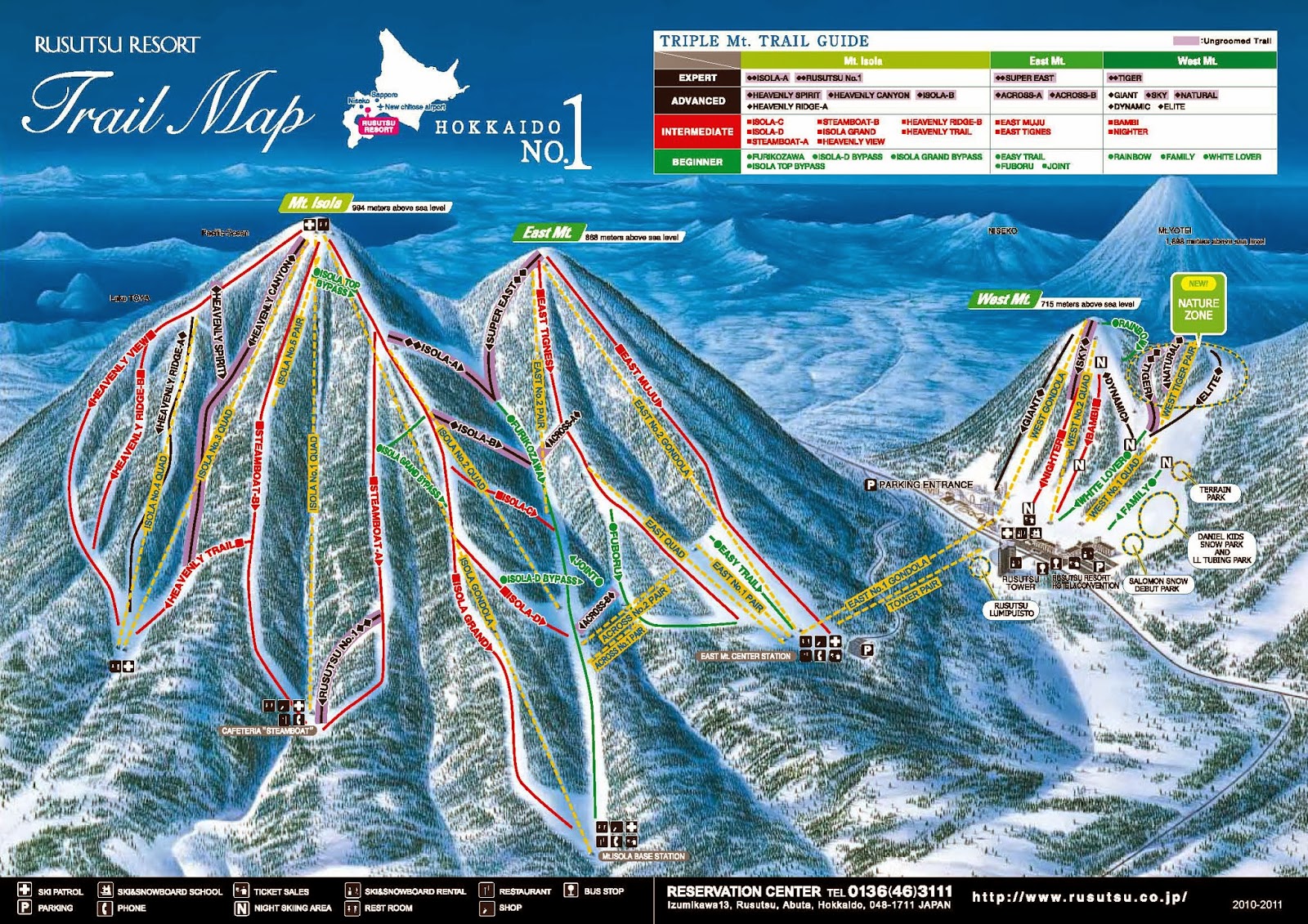 Rusutsu tiene dos zonas perfectamente diferenciadas, la que esta pegada al Resort (Zona Oeste), y otra que esta al otro lado de la carretera a la cual se llega después de subir en un telecabina (Zona Este)