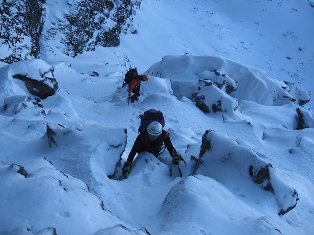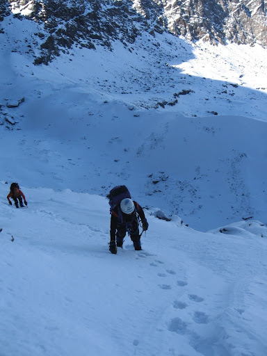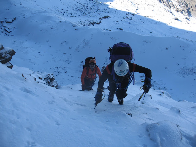 Técnicamente no tiene mucha dificultad y además es más tumbado de lo que se vé en las fotos burla, peeeero en cualquier otro corredor que sea más o menos vertical, por lo menos uno piensa en que si te caes te puede dar tiempo a intentar la autodetención, pero en esta cosa que hicimos que es más horizontal que vertical, había pasos que a metro y medio ya tenias el cortado así que olvidate de intentar autodetenerte y la nieve en la mayoría de la travesía nieve papa, que había uno que yo me sé y no vpy a decir el nombre, parecía que estaba nadando en una piscina de Aljama PerdidoPerdidoPerdido, así que reiros de mí pero eso tenía más peligro que una piraña en un bidé Ojos y dientesOjos y dientes