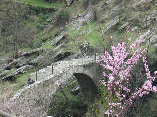 Es la primera vez que veía ese puente, pero es posible que se trate de ese, pues según veo el puente se restauró hace poco y como ves en la foto parte de el está ahora derrumbado. Puede que la noticia se refiriera a ese derrumbe. O quizás entre ayer y el sábado se cayó aun más. Desde luego, en la carretera, justo por encima del puente había un derrumbe reciente. se había ido parte de la calzada (pongo foto abajo). Pero es que todo el trayecto por carretera entre Órgiva y Mecina Bombarrón estaba lleno de desprendimientos.