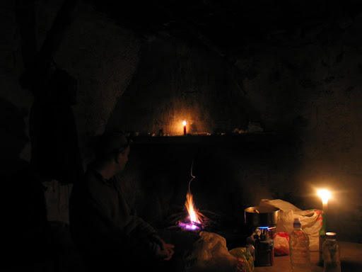 Pero esa intriga es parte de la emoción de hacer una ruta nueva. Las únicas referencias que tenía de esos sitios era lo que sale en el apartado de refugios del libro de Lorenzo Arribas, de esquí de montaña por Sierra nevada. Pero vamos en caso de encontrarlos en mal estado había alternativas. Hora y media antes de llegar a Hoya Lavada habia pasado por una caseta de incendios que no estaba mal y era una posibilidad en caso de haber dado la vuelta. Y ya cruzando la sierra, si el corral de Prado Largo lo encontraba mal, no iba a volver para artrás, la alternativa habria sido o vivaquear a pelo. o seguir caminando hasta Aldeire y ya allí o en La Calahorra buscarme la vida en algun alojamiento.