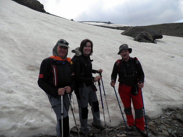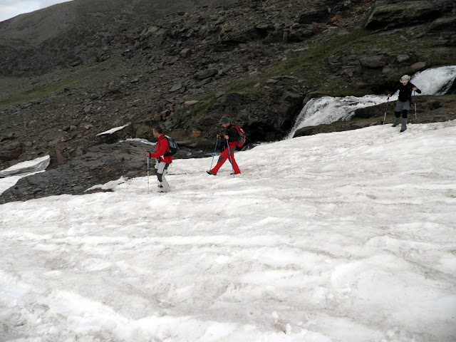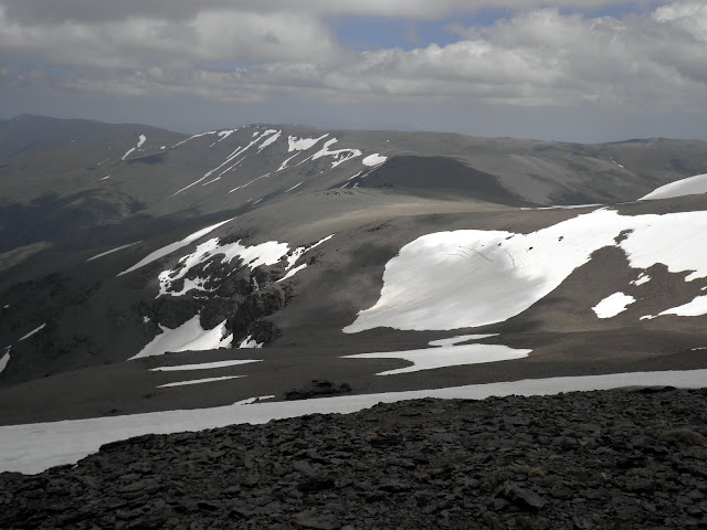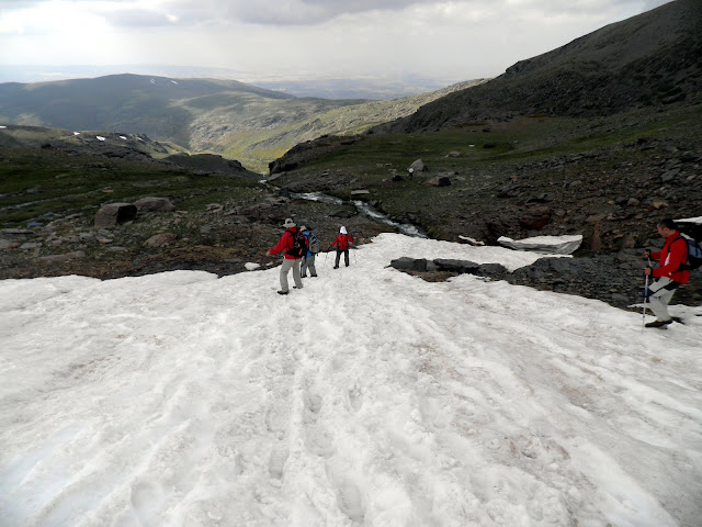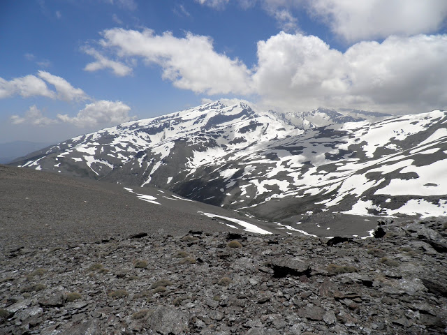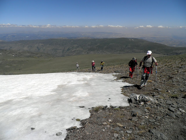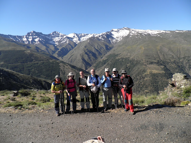 Empezamos con un día hermoso y claro, con los tres reyes a nuestras espaldas: de izquierda a derecha: Alcazaba, Mulhacén y el Veleta