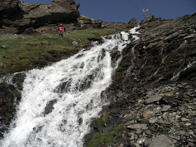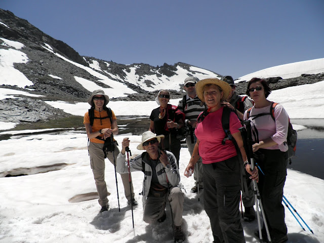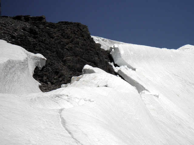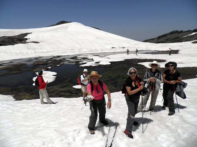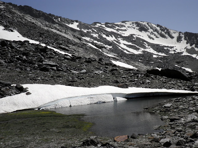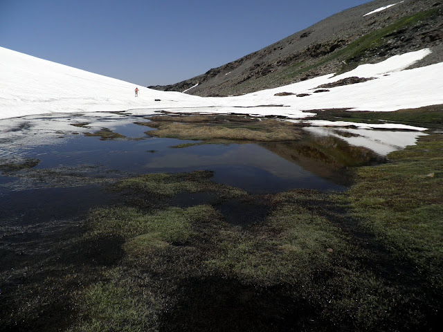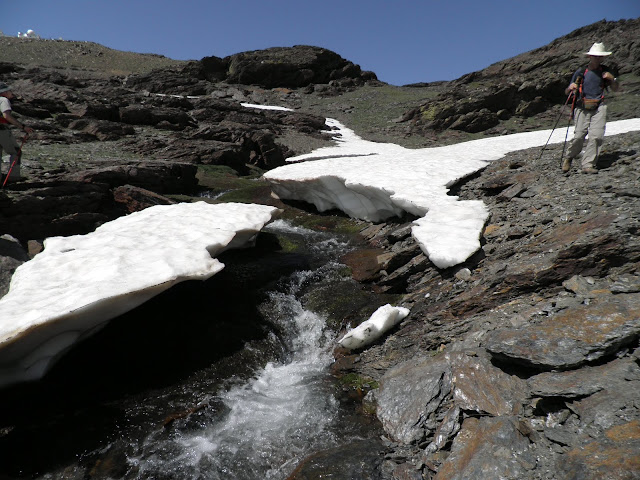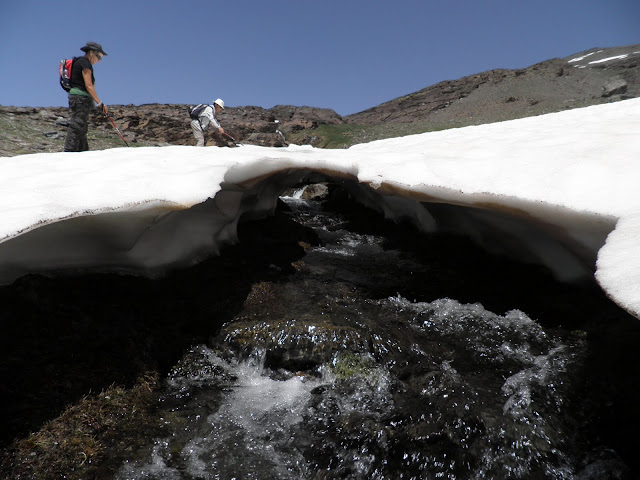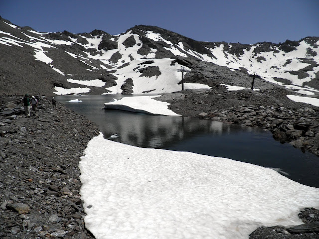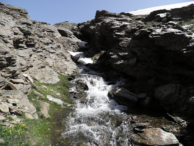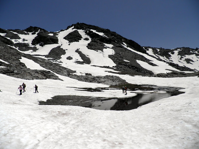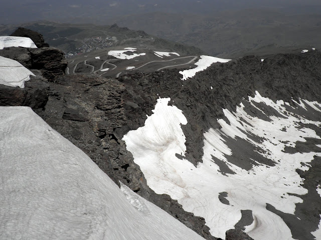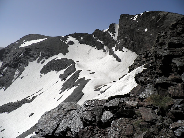 Este es el famoso corral del Veleta, que en otoño de 2009 atravesamos para llegar a los Machos. Ahora es imposible bajar. De hecho murio hace unos días un experto montañero al intentar bajar. Curiosamente, estando esta zona repleta de montañeros y más de un "guiri" en bikini y chanclas, no vimos a nadie en el corral, que es un lugar frecuentado por los expertos para hacer el canuto o escalada
