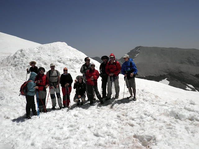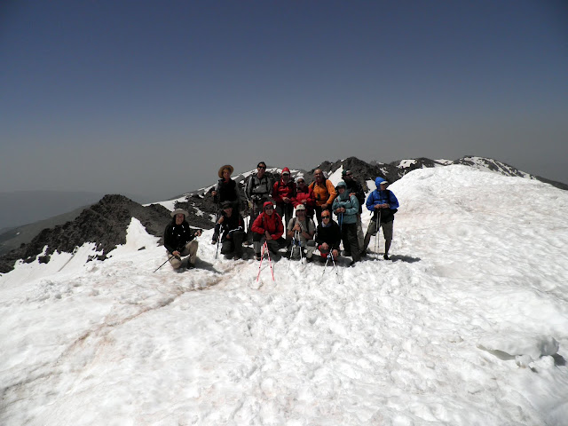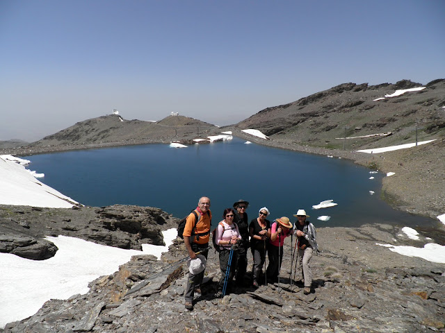 Los 14 del grupo en el Veleta con el Mulhacén al fondo