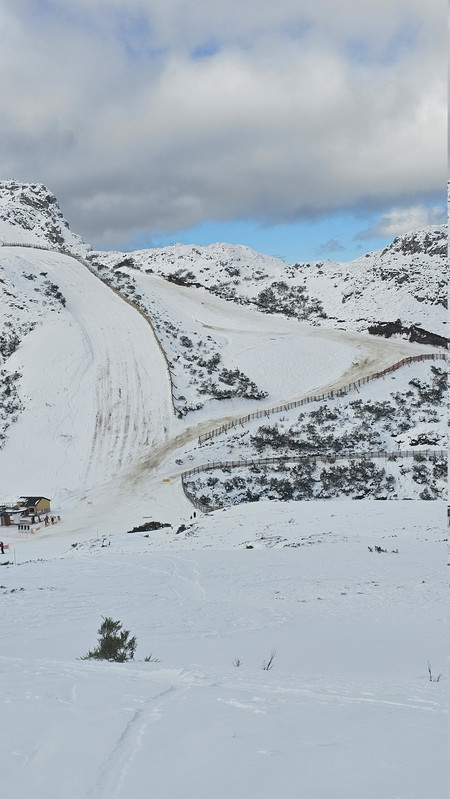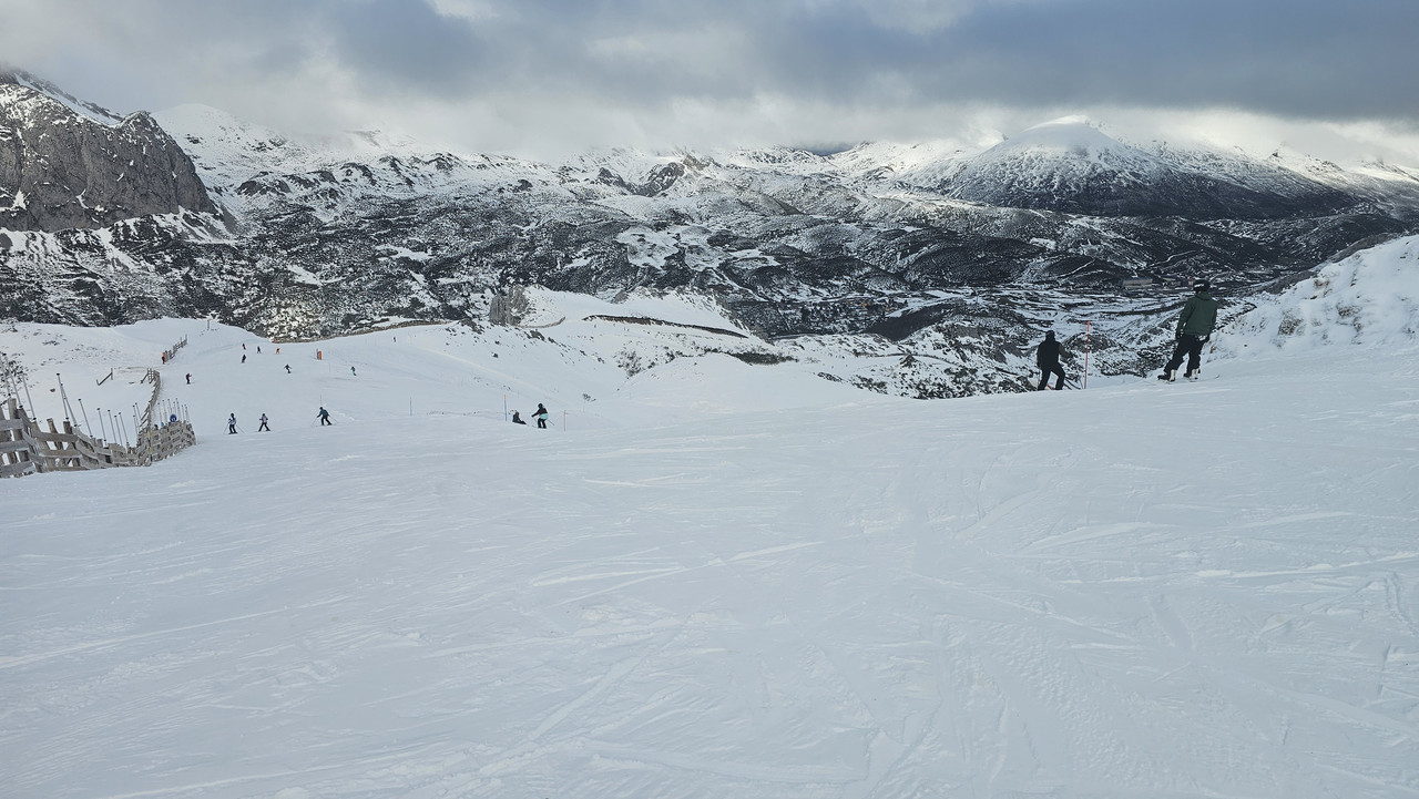Hoy jueves 22 de enero estaba claro que había unas horas de buen tiempo, una ventana entre dos borrascas muy profundas. Había que aprovechar como fuera. La estación prácticamente vacía, absolutamente nadie. Bastante frío, nieve polvo seca muy buena y también dura, y arriba del todo hasta 4 cm nuevos de la noche.