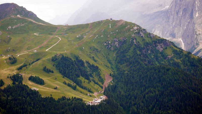 Sì, los edificios que se ven en la foto estan en la zona llamada Pecol, de aqui llega el huevo desde Canazei y sube el huevo hasta Belvedere y el teleferico hasta Coll de Rossi.